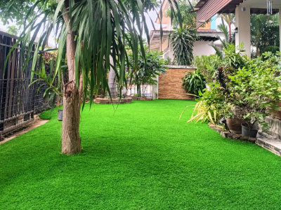 ตกแต่ง เปลี่ยนปูนเปลือยธรรมดาไม่โดดเด่นเป็นหญ้าเทียมเขียวสดใสตลอดเวลา ให้บรรยากาศดูเป็นธรรมชาติ ร่มรื่น ตอบโจทย์ความต้องการของลูกค้ามากที่สุดในตอนนี้
